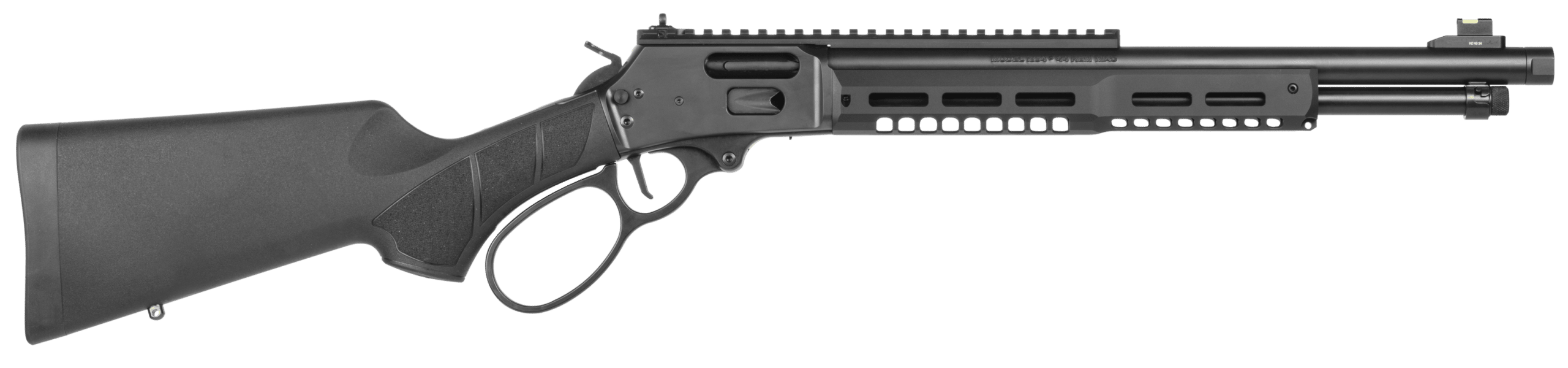 The Smith & Wesson Model 1854 Stealth Hunter is a modern take on a classic lever-action platform designed for field use and modularity. It is chambered in .44 Magnum and pairs a compact 16.3 inch threaded barrel with a lightweight synthetic stock and a Picatinny rail for optics. The rifle features an aluminum M-LOK handguard and factory sights that support a range of practical shooting configurations.