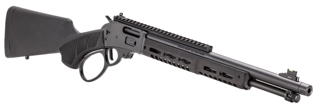 The Smith & Wesson Model 1854 Stealth Hunter is a modern lever-action rifle that combines classic handling with contemporary utility features. Chambered in .45 Long Colt, it is built on a forged 416 stainless steel receiver and fitted with a black synthetic stock featuring textured grip panels. The design provides an optic-ready top rail and an M-LOK handguard for modular accessory mounting.