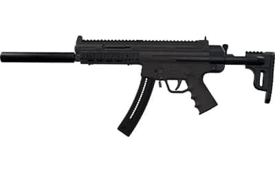 The American Tactical (ATI) GSG-16 is a .22 LR semi-automatic carbine built on the GSG operating system with a modern sporting-style layout. It pairs a polymer receiver and M-LOK-equipped handguard with a collapsible synthetic stock that includes an internal magazine storage compartment. Controls include an ambidextrous safety and charging handle, adjustable flip-up sights, and a faux suppressor on the muzzle.
