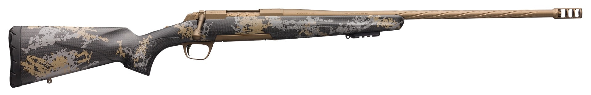 The Browning X-Bolt Mountain Pro is a bolt-action sporting rifle chambered in 6.5 Creedmoor with a 22-inch fluted, threaded barrel. It carries a Burnt Bronze Cerakote finish on the stainless barrel and action and features camouflage accents and field-oriented features. The rifle includes recoil-management hardware and on-rifle accessory provisions for practical hunting use.