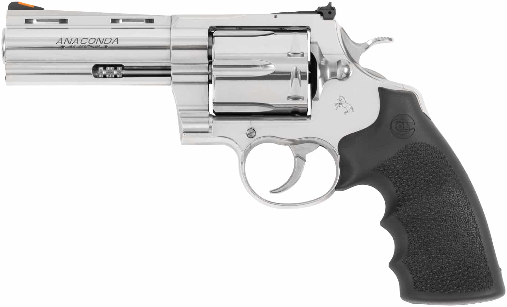 The Colt Anaconda is a heavy-duty stainless-steel revolver chambered in .44 Magnum with a six-round cylinder and Hogue overmolded grips for improved handling. It combines Colt's large-frame action and adjustable sights for controlled, repeatable performance on the range or in the field. The design emphasizes smooth trigger operation via a linear leaf spring action and durable stainless construction.