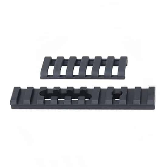 Standard M1913 Picatinny rail configuration - Anodized flat black aluminum - Mounting does not require alteration of AR Handguard heat shields - Includes socket head mounting screws with special flat nuts for an unobrusive mount - Includes ERGO LowPro Rail Covers - Overall Length: 4.155 inches - 10 Slots - Will fit Savage 338 Lapua 110BA stock - 1.100 - 2.100 Inch Hole Spacing