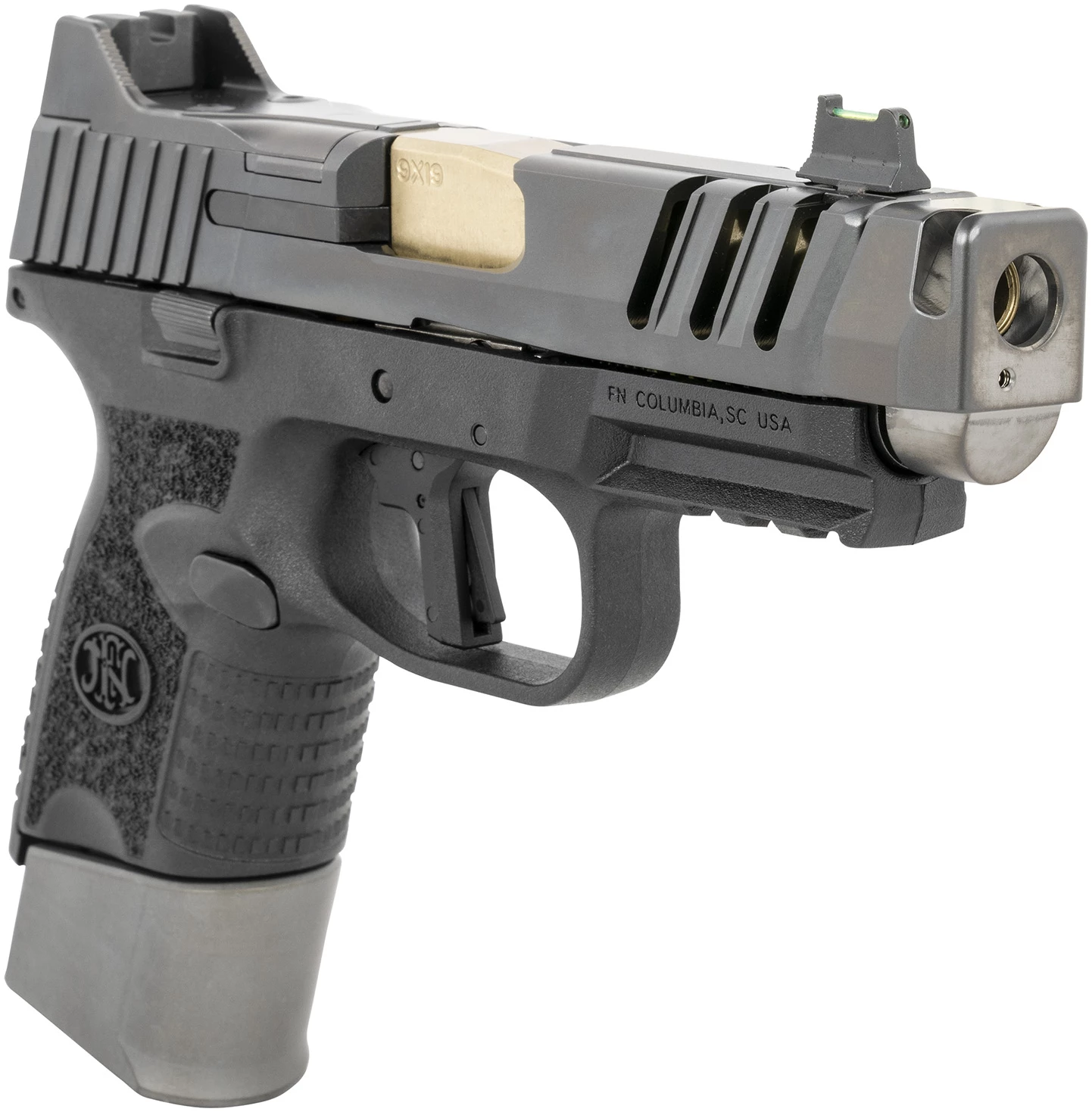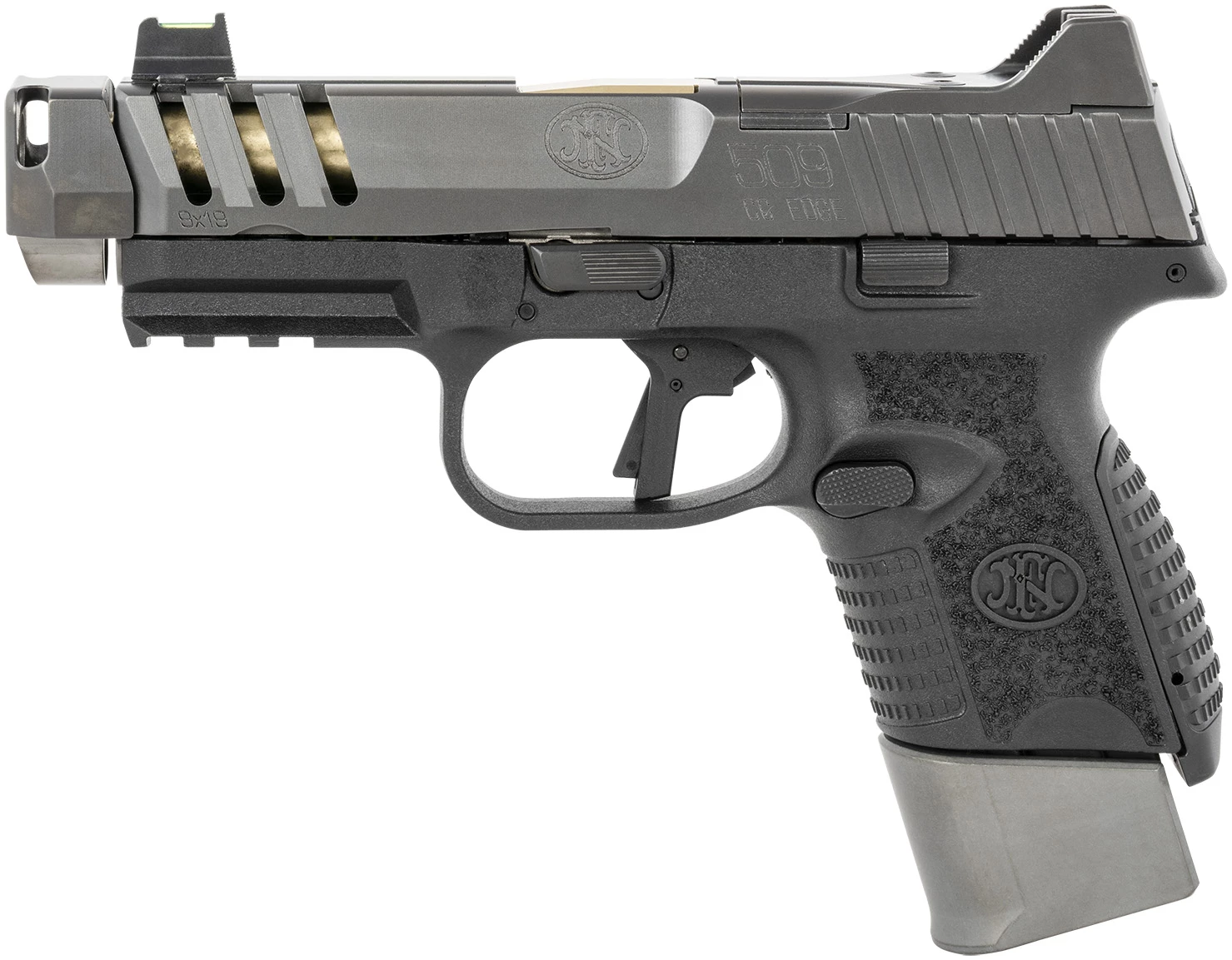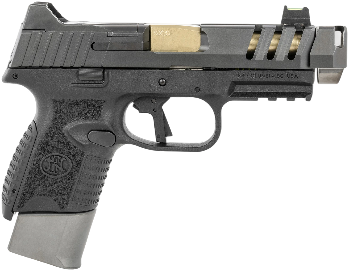 FN 66101347 509 CC Edge 9mm Luger 12+1/15+1 (2) 4.20" Threaded Gold Barrel, Black Frame, Graphite Optic & Lightening Cut Slide, Optic Height Fiber Optic Sights, Compensator (No Manual)