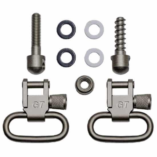 Set includes 7/8 machine screw fore end swivel stud with nut 3/4 wood screw stud rear spacers and pair of GT Locking Swivels. - GTSW-08 1-1/4 Loops Black-Oxide Finish