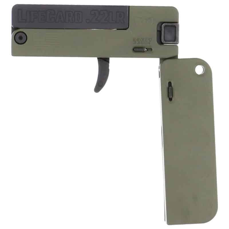 Trailblazer Firearms LifeCard is an ultra-compact, folding single-shot pistol chambered in .22 LR. Its credit-card-size polymer handle in OD green and folding design make it suitable for minimalistic everyday carry and recreational rimfire use. The single-action mechanism and lightweight construction emphasize simplicity and portability for users who prioritize a low-profile option.