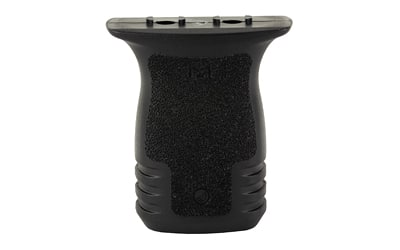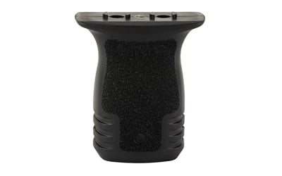 A Compact textured vertical grip designed to minimize material and dimension while providing a positive grip surface. Allows the support hand to apply rearward pressure, keeping the weapon shouldered, yielding better muzzle control and accuracy.