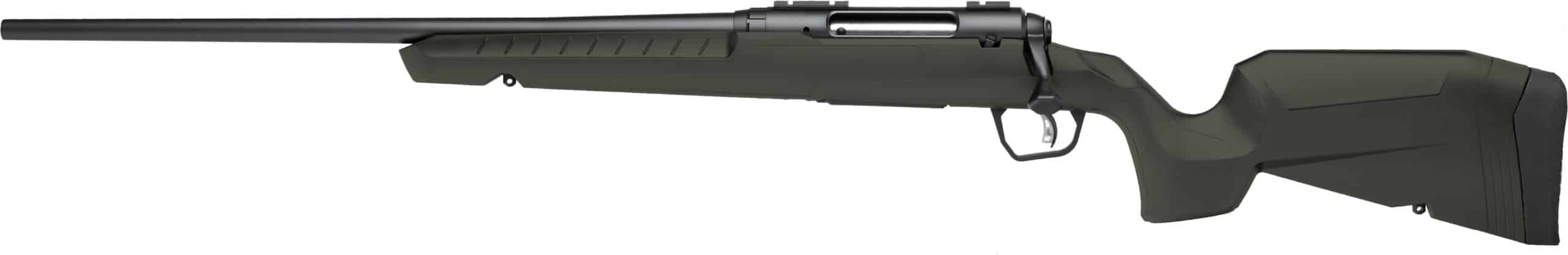 - The stock is a fixed green synthetic design with integral swivel studs.