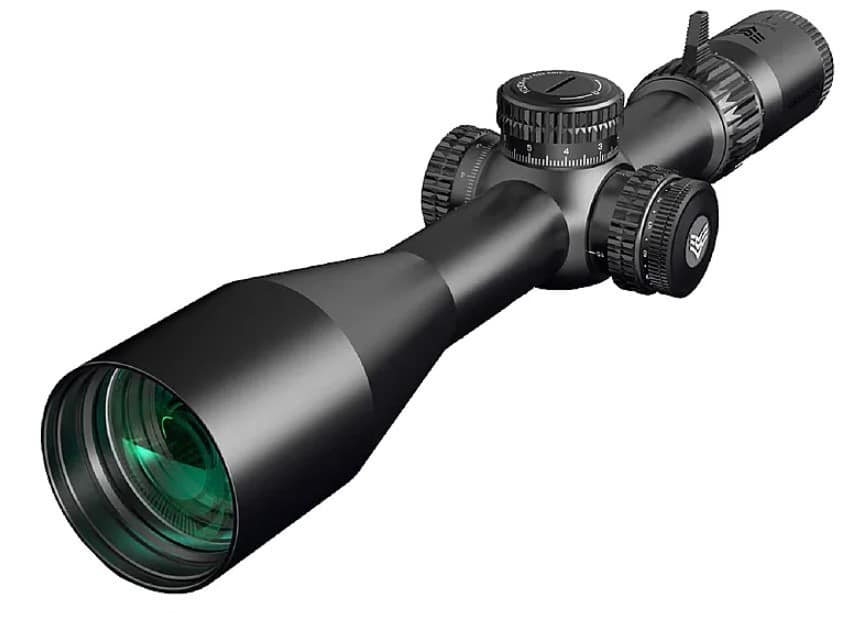 - The riflescope uses a first-focal-plane configuration for holdover consistency across magnification.