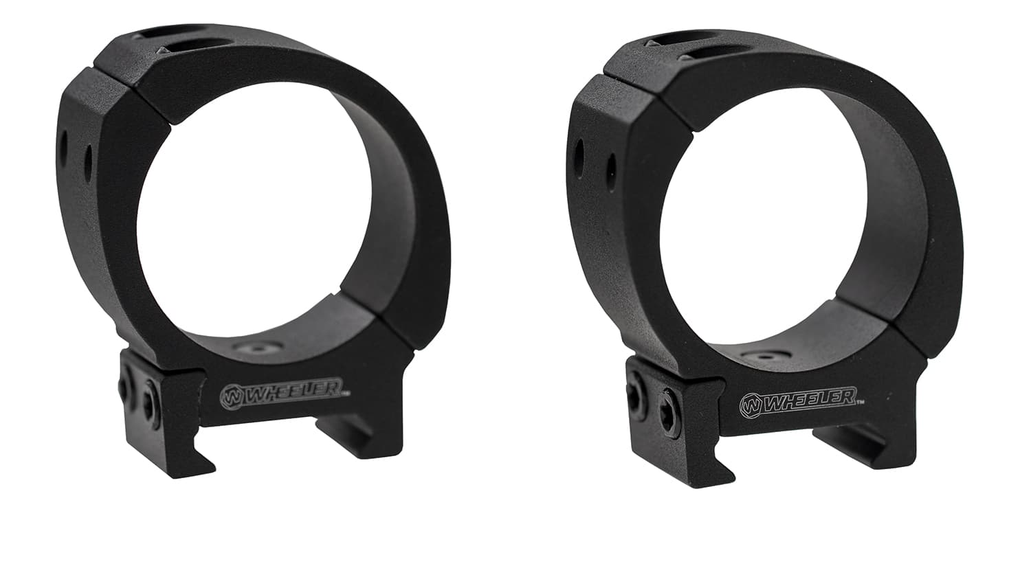 The Wheeler Sporter Bi-Weaver 30mm High scope rings are designed to mount 30mm optic tubes and provide compatibility with Weaver and Picatinny rail systems. These rings feature an adjustable base that converts between Weaver and Picatinny profiles and a four-screw offset design for field adjustments. Constructed from 6061 aluminum, they are intended for general sporting and target use where a higher ring height is required.